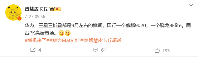 博主@智慧皮卡丘還於文中透露,國行版本的華為三摺疊新機將搭載麒麟處理器;而三星的三摺疊新品將搭載驍龍8Elite處理器。屆時兩台手機將在高端擂台正面“硬剛”。