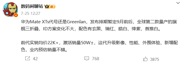 同時另一位數碼博主@數碼閒聊站稱,華為的全新三摺疊手機代號“Greenlan”,外觀相比前代(Mate XT)變化不大,有玄黑、瑞紅、皓白、絳紫四種配色可選。Mate XT實銷均價2.2萬元以上,激活銷量在50萬部左右,Mate XTs對影像、性能、外圍體驗進行了升級,還有新配色,預估銷量更高。