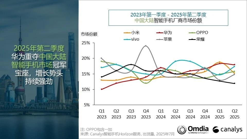 7月28日,根據Canalys的最新研究,2025年第二季度,中國大陸智能手機市場同比下降4%,此前年初國家補貼政策帶來的增長效應開始減弱。華為以1220萬台的出貨量重奪市場第一,佔據18%的市場份額;vivo緊隨其後,出貨量為1180萬台,佔據17%的份額;OPPO(含一加)以1070萬台排名第三,佔比16%。小米連續第八個季度實現同比增長,以1040萬台的出貨量位居第四;蘋果則以1010萬台排名第五。