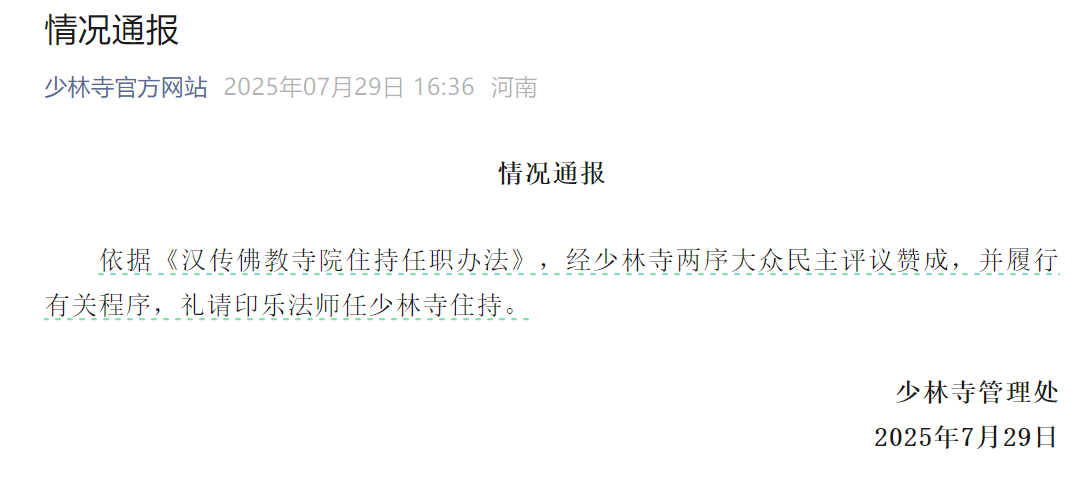 29日下午,少林寺管理處發佈消息,依據《漢傳佛教寺院住持任職辦法》,經少林寺兩序大眾民主評議贊成,並履行有關程序,禮請印樂法師任少林寺住持。