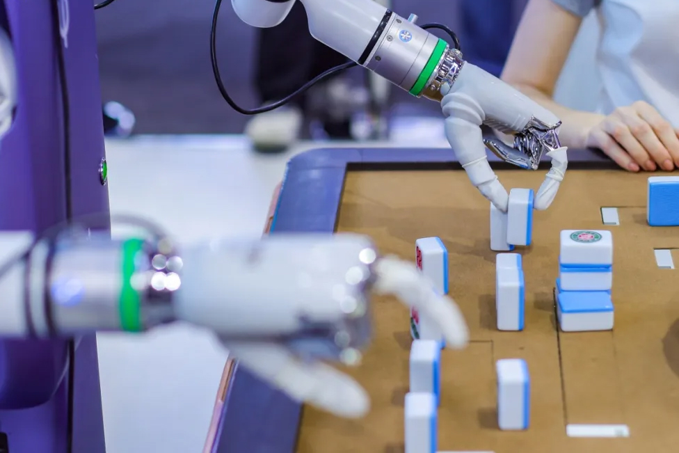 靈初智能麻將機器人與現場觀眾同桌博弈的場景吸引了眾多參觀者圍觀。機器人可與現場觀眾共同完成30分鐘以上的連續麻將對局,以毫米級精度完成摸牌、放置、碰槓等複雜操作,在與人類玩家的即時博弈中展現策略思考,動態構建決策鏈,自主完成碰槓等博弈決策。