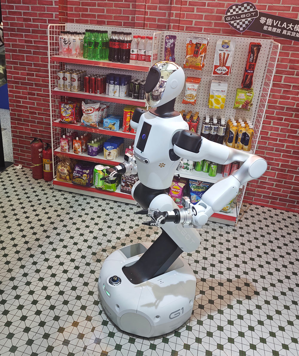 在企業自主展區,銀河通用搭建了1:1還原的真實商超場景,由Galbot進行全天候值守,在自主推理、零遙操的情況下為觀眾從貨架上精準取送商品。