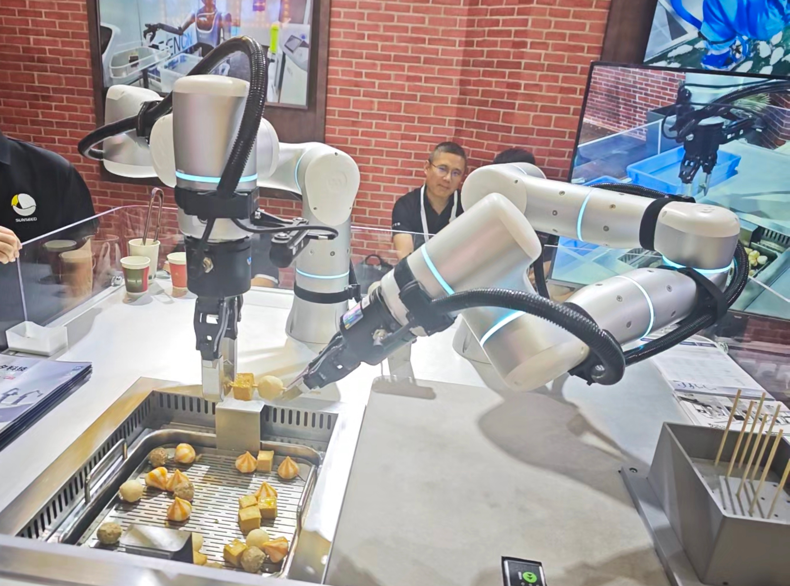 在WAIC的中央展區,非夕的雙臂機器人則給觀眾們串起了關東煮串串,可在觀眾挑選關東煮種類後智能識別原料種類,實現自動抓取、智能穿串、精準加熱及柔性交付。