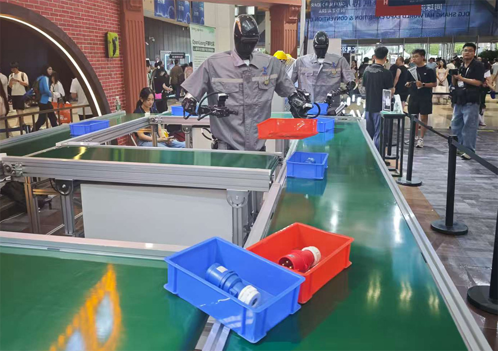 在“WAIC裏技能大舞台”的智造車間區域,國地中心研發的“青龍”機器人正身着工作服,有序地進行自動化物料分揀作業。它的核心正是基於600萬真機數據和VLA預訓練,形成的2.8B操作大模型。