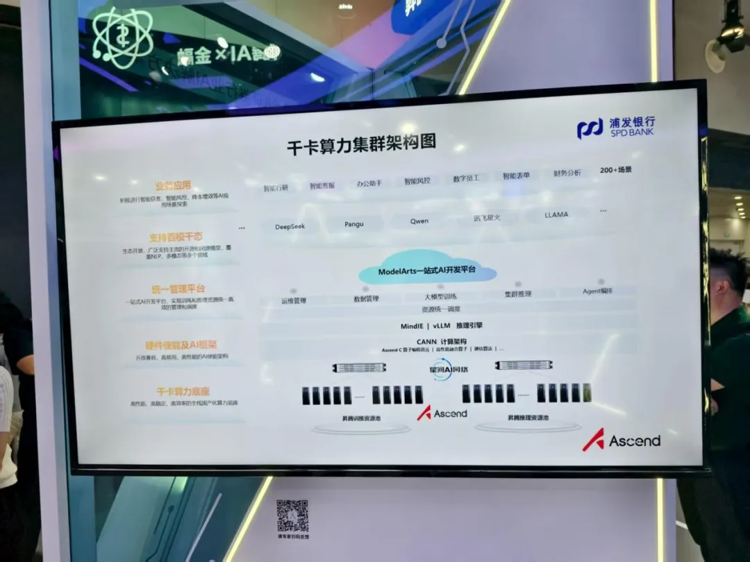 金融行業也在積極攜手昇騰,擁抱智能化。交通銀行基於昇騰千卡算力集羣,瞄準審貸聯動、惠民催收、數據速查等大模型高價值場景,通過全流程優化,大幅減少人工校驗工作量,縮短處理時間,目前已落地大小模型融合應用超100個,累計提升人力效能超1000人。浦發銀行基於昇騰千卡算力集羣,採用CANN架構,通過MindIE硬件使能引擎及ModelArts一站式AI開發平台進行統一納管,支持DeepSeek、Qwen等多種主流大模型的部署,幫助浦發銀行實現運營、普惠、零售、信用卡等200多個AI應用場景落地。