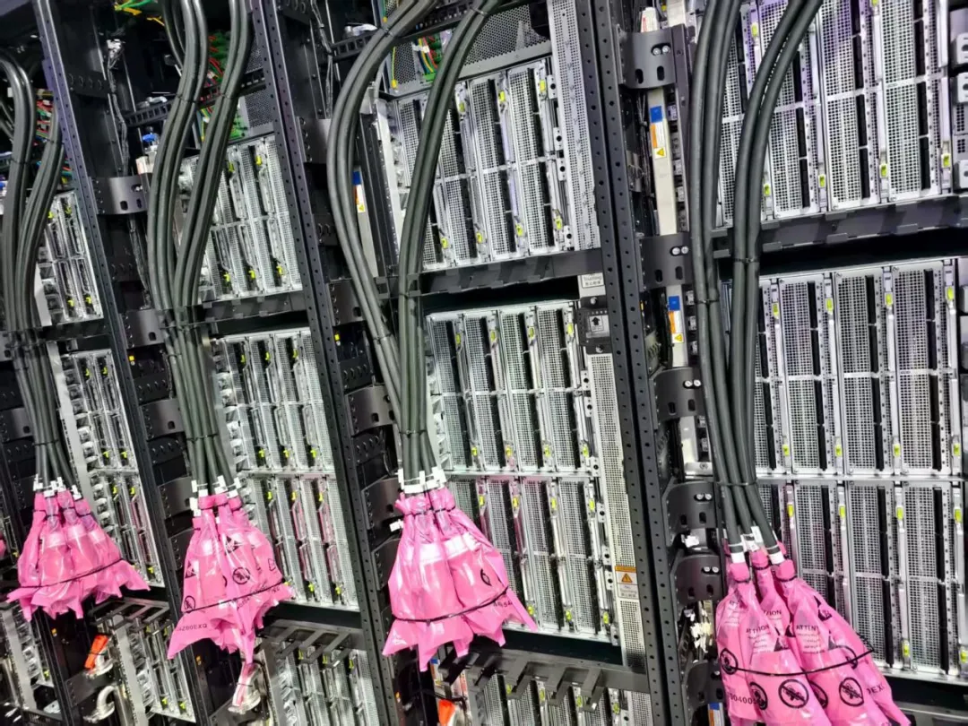 在這種趨勢下,華為充分發揮在通信、存儲、基礎軟件等方面的大雜燴優勢,通過非摩爾補摩爾、數學補物理等系統工程創新,成功實現業界最大規模的384顆昇騰NPU高速總線互聯,構建了昇騰384超節點。它由12個計算櫃和4個總線櫃構成,算力總規模達300 PFLOPS。