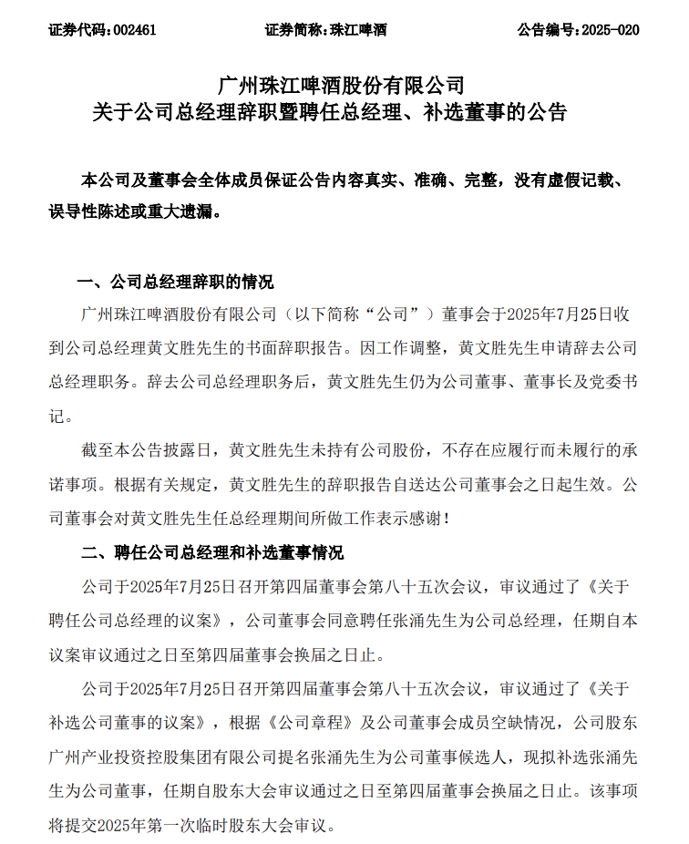 7月25日晚間,廣州珠江啤酒股份有限公司(股票代碼:002461.SZ)發佈公告稱,公司董事會於2025年7月25日收到公司總經理黃文勝的書面辭職報告。因工作調整,黃文勝申請辭去公司總經理職務。辭去公司總經理職務後,黃文勝仍為公司董事、董事長及黨委書記。