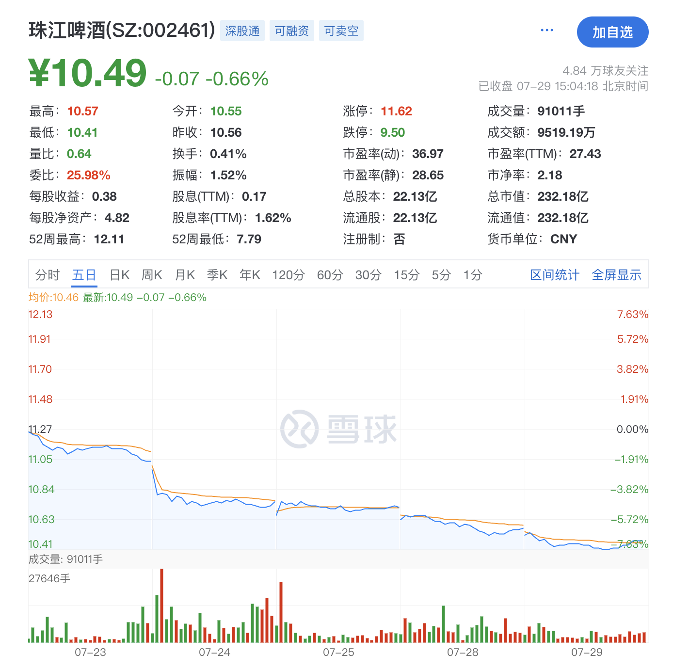 新的將帥組合,能否一邊穩定業績增長,一邊在全國打開新局面,或許還有待市場驗證。資本市場上,珠江啤酒的股價已連續多日走低,截至7月29日收盤,每股報10.49元,總市值約232.18億元。