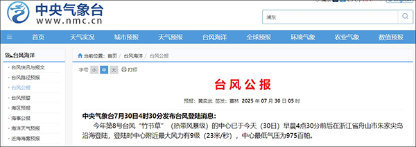 據中央氣象台網站消息,中央氣象台7月30日4時30分發布颱風登陸消息: