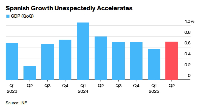 由於對進出口貿易依賴程度遠低於其他歐元區國家,以及內部旅遊業蓬勃發展、勞動力市場有所改善等,西班牙經濟在關税陰影下仍表現亮眼。西班牙統計局(INE)29日最新發布的數據顯示,西班牙國內生產總值(GDP)在第二季度實現了0.7%的增長,高於第一季度的0.6%,也超出了一些分析師的預期。