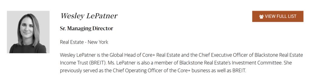 公開資料顯示,韋斯利·萊帕特納是黑石集團核心房地產全球主管及黑石房地產收入信託基金(BREIT)首席執行官。她同時擔任黑石房地產投資委員會成員。此前,她曾擔任核心+業務及BREIT的首席運營官。