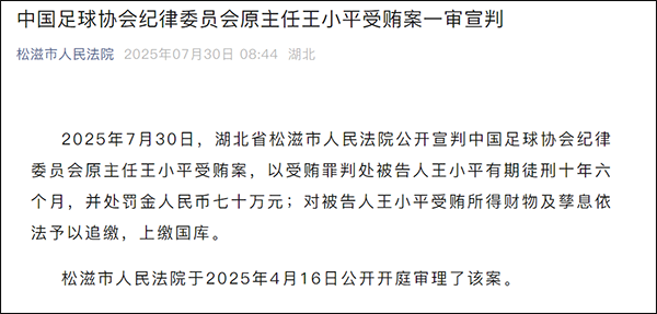 微信公眾號“松滋市人民法院”消息,7月30日,湖北省松滋市人民法院公開宣判中國足球協會紀律委員會原主任王小平受賄案,以受賄罪判處被告人王小平有期徒刑十年六個月,並處罰金人民幣七十萬元;對被告人王小平受賄所得財物及孳息依法予以追繳,上繳國庫。