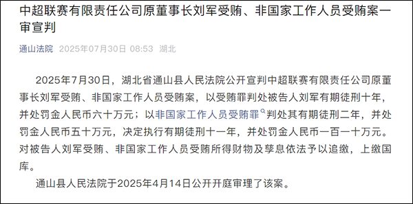 微信公眾號“通山法院”消息,7月30日,湖北省通山縣人民法院公開宣判中超聯賽有限責任公司原董事長劉軍受賄、非國家工作人員受賄案,以受賄罪判處被告人劉軍有期徒刑十年,並處罰金人民幣六十萬元**;**以非國家工作人員受賄罪判處其有期徒刑二年,並處罰金人民幣五十萬元,**決定執行有期徒刑十一年,並處罰金人民幣一百一十萬元。**對被告人劉軍受賄、非國家工作人員受賄所得財物及孳息依法予以追繳,上繳國庫。