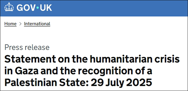 當地時間7月29日,英國首相府發佈關於加沙人道主義危機和承認巴勒斯坦國的聲明。