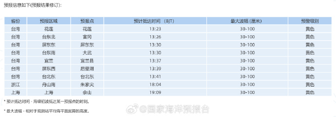 國家海洋預報台公佈海嘯預計到達台灣、浙江、上海沿海時間