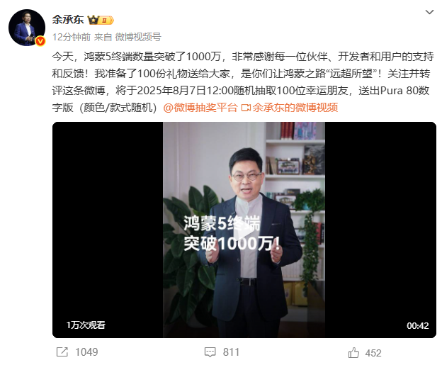 7月30日,華為終端BG董事長餘承東透露,搭載鴻蒙操作系統5(HarmonyOS 5)的終端數量正式突破1000萬。