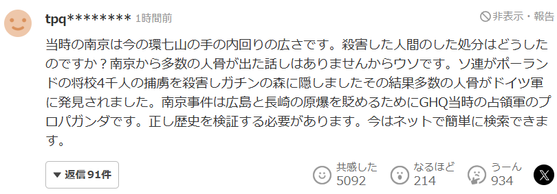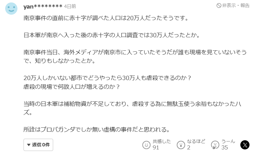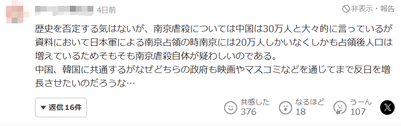 評論區點贊數第一的評論就表示:“雖然我不想否認歷史,但中國大肆宣傳南京大屠殺遇難者有30萬,而資料中被日軍佔領時南京只有20萬人口,而且之後南京的人口還有增加,所以南京大屠殺一事本來就值得懷疑。中國和韓國都會這樣,為什麼這兩國的政府都想通過電影和社交媒體來助長對日本的仇恨呢?”