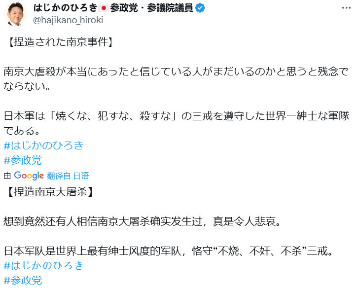 對大多數日本網民的評論,可作為參考的是新當選的極右翼政黨參政黨的參議員初鹿野裕樹在社交媒體上的表態。初鹿野裕樹發帖稱:“竟然還有人相信南京大屠殺確實發生過,真是令人悲哀。日本軍隊是世界上最有紳士風度的軍隊,恪守‘不燒、不奸、不殺’三戒。”