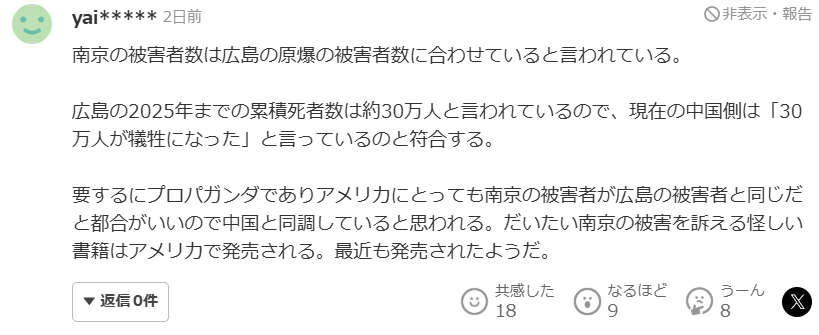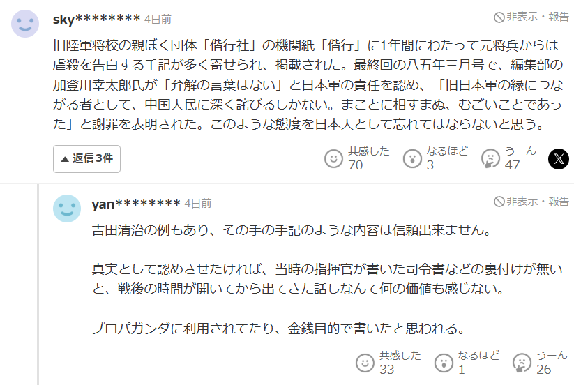 在評論區的前兩頁,僅有一位日本網友貼出了日本方面自己的歷史材料,表示“日軍毫無疑問對虐殺行為負有責任”。這名網友還引用材料編輯者的話稱“只能向中國人民致以最深切的歉意”,並表示作為日本人永遠都不能忘記這種態度。但毫不令人意外的是,馬上有其他日本網民在回覆中質疑相關材料的真實性。