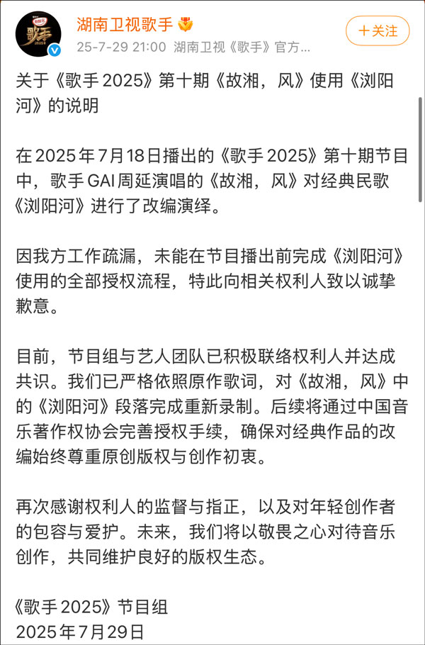 7月29日晚,@湖南衞視歌手 發佈關於《歌手2025》第十期《故湘,風》使用《瀏陽河》的説明,這也是《歌手2025》節目組第二次就此事發文回應: