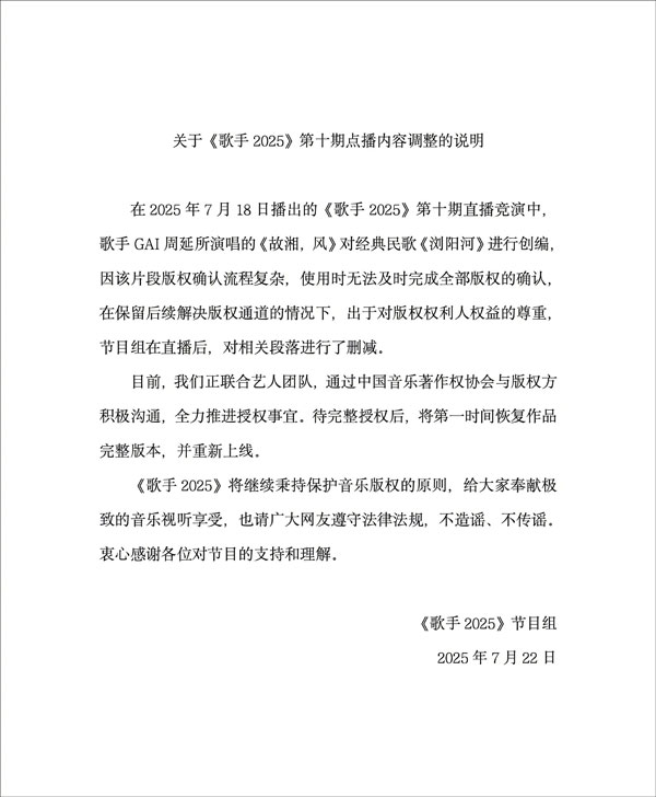 7月22日,@湖南衞視歌手 發文回應第十期GAI《故湘,風》內容調整爭議:在2025年7月18日播出的《歌手2025》第十期直播競演中,歌手GAI周延所演唱的《故湘,風》對經典民歌《瀏陽河》進行創編,因該片段版權確認流程複雜,使用時無法及時完成全部版權的確認,在保留後續解決版權通道的情況下,出於對版權權利人權益的尊重,節目組在直播後,對相關段落進行了刪減。