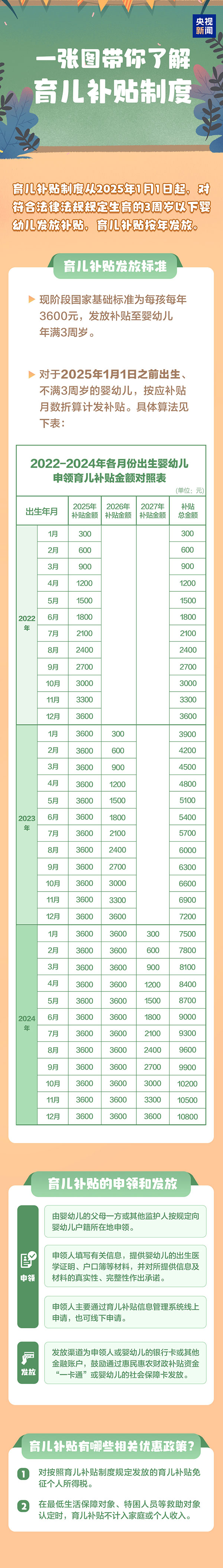 國家衞生健康委人口家庭司司長王海東表示,關於對3歲以下嬰幼兒發放育兒補貼,主要考慮是,0~3歲是兒童成長的關鍵階段,也是家庭養育特別需要支持的重要時期。針對3歲以下嬰幼兒家庭提供生育支持,也是國際上的通行做法。結合我國發展階段和財力狀況,育兒補貼制度覆蓋3歲以前的嬰幼兒養育階段。