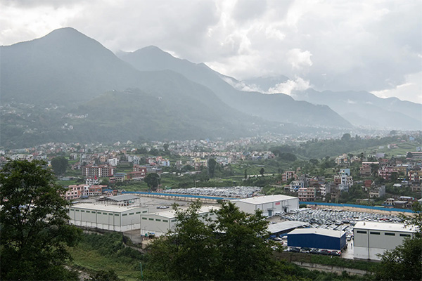 尼泊爾喬巴爾陸港內停放的進口電動汽車