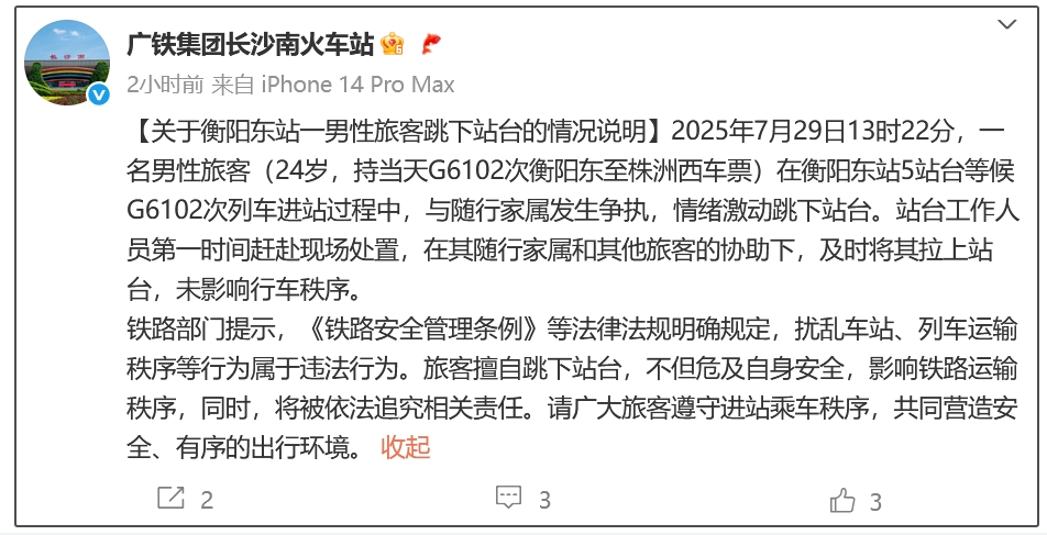 2025年7月29日13時22分,一名男性旅客(24歲,持當天G6102次衡陽東至株洲西車票)在衡陽東站5站台等候G6102次列車進站過程中,與隨行家屬發生爭執,情緒激動跳下站台。站台工作人員第一時間趕赴現場處置,在其隨行家屬和其他旅客的協助下,及時將其拉上站台,未影響行車秩序。