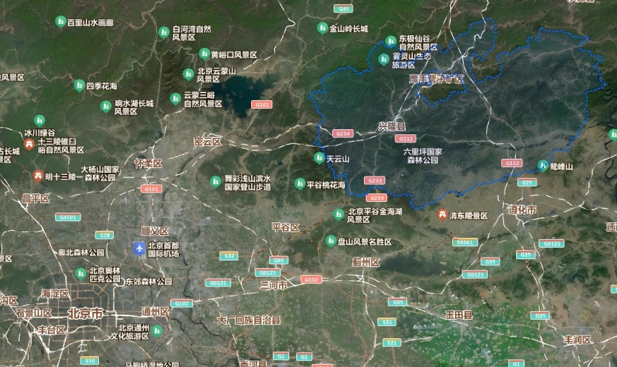 興隆縣的地理位置,從衞星圖可見當地多山,山谷地區易受暴雨帶來的洪澇和地質災害影響
