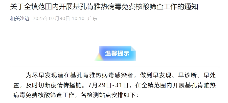 在此背景下,佛山市順德區樂從鎮宣佈將於7月29日至31日,在全鎮範圍內開展基孔肯雅熱病毒免費核酸篩查工作。樂從鎮沙邊村居委會公眾號在30日發佈了這一通知,並表示:當前基孔肯雅熱疫情防控形勢嚴峻,為儘早發現潛在基孔肯雅熱病毒感染者,做到早發現、早診斷、早處置,及時切斷疫情傳播鏈。沙邊村居委會工作人員介紹,可按照通知指引就近檢測。據佛山市順德區衞健局最新數據,樂從鎮確為近期新增報告基孔肯雅熱確診病例的主要區域之一。