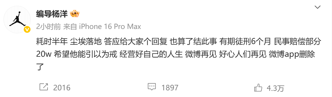 車主編導楊洋發文稱:“耗時半年,塵埃落地,答應給大家個回覆,也算了結此事。有期徒刑6個月,民事賠償部分20w,希望他能引以為戒,經營好自己的人生。”
