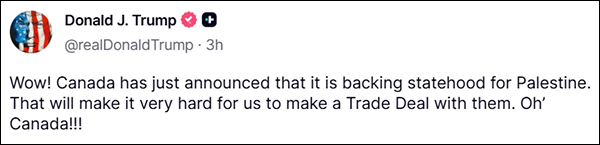 特朗普31日凌晨也在社交媒體上對加拿大發出威脅。他寫道:“哇!加拿大剛剛宣佈要支持巴勒斯坦國。這將讓我們很難與他們達成貿易協議。哦,加拿大!!!”
