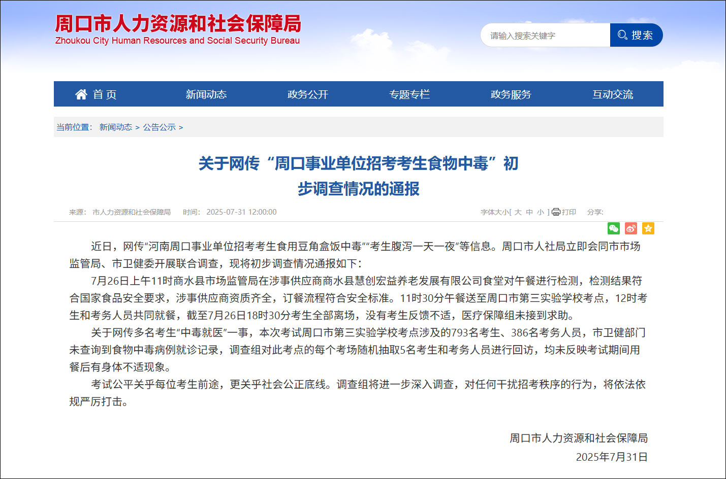 河南省周口市人力資源和社會保障局網站31日發佈情況通報稱:關於網傳多名考生“中毒就醫”一事,本次考試周口市第三實驗學校考點涉及的793名考生、386名考務人員,市衞健部門未查詢到食物中毒病例就診記錄,調查組對此考點的每個考場隨機抽取5名考生和考務人員進行回訪,均未反映考試期間用餐後有身體不適現象。