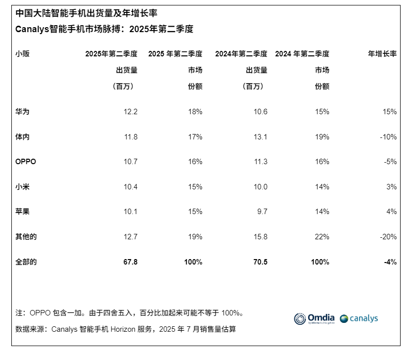 根據Canalys(現為Omdia旗下公司)的最新研究,2025年第二季度中國大陸智能手機市場同比下降4%,原因是年初國家補貼政策帶來的提振效應開始減弱。