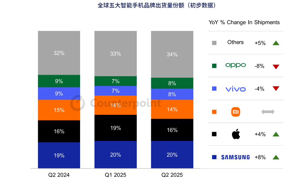 根據Counterpoint Research初步估計,2025年第二季度全球智能手機出貨量同比增長2%。這是全球智能手機出貨量連續第二個季度增長,主要得益於北美、日本和歐洲市場的推動。其中,蘋果延續了增長軌跡,在北美、印度和日本強勁表現的推動下,同比增長4%。據預計,隨着iPhone 17系列的預期發佈以及對生態系統產品捆綁銷售的日益重視,蘋果將在下半年保持這一勢頭。