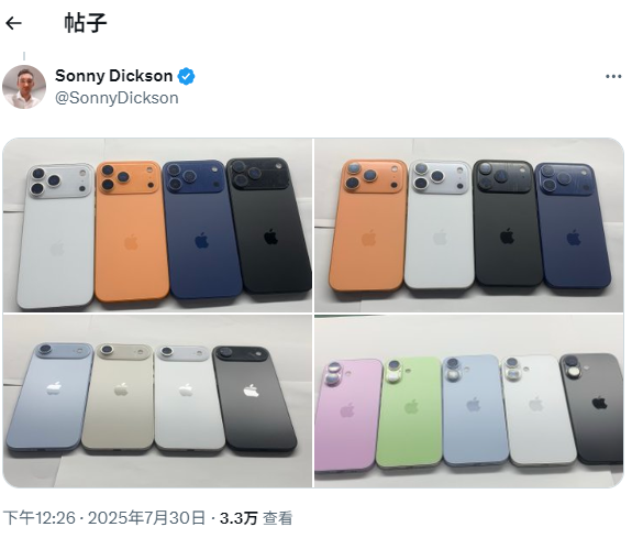7月30日,博主@Sonny Dickson分享了一組iPhone 17的機模照片,展示了新機的多款配色,其中橙色首次出現。