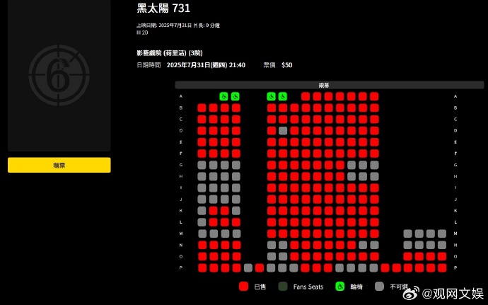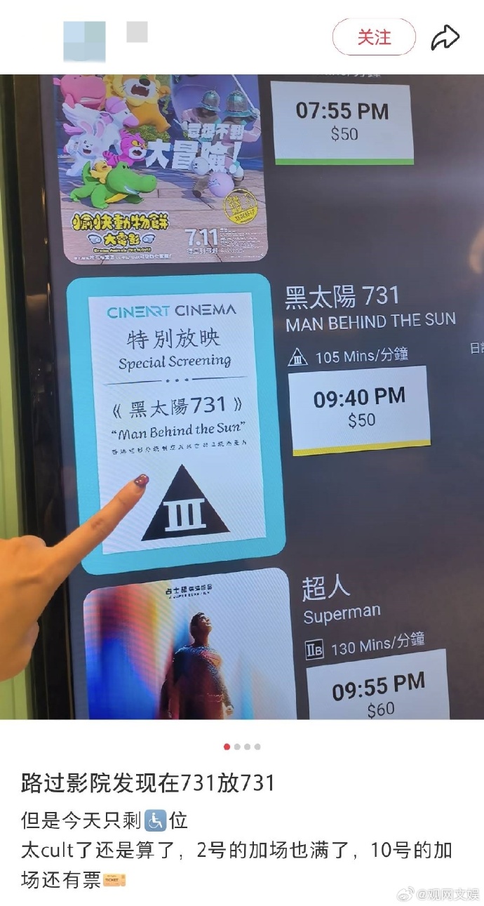今日(7月31日),有網友發現香港有影院進行了《黑太陽731》特別放映,7月31日和8月2日兩場都已滿座售罄,引發關注。