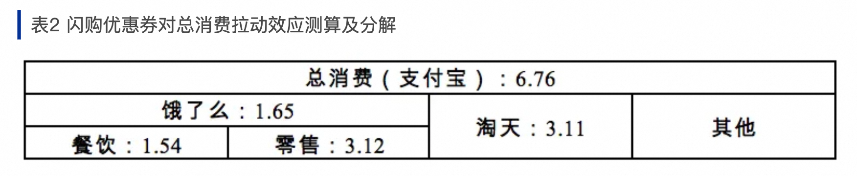北大團隊以淘寶閃購為例研究發現,閃購優惠券對外賣消費的拉動係數達到1.65;溢出到線上電商實物消費(不含閃購),拉動係數達到3.11;而從支付端的總消費來看,拉動係數達到6.76。