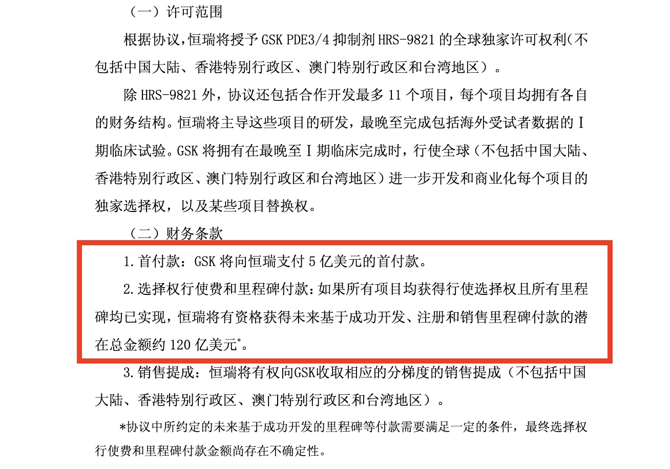 根據協議內容,GSK將向恆瑞醫藥支付總計5億美元的首付款。其中,恆瑞醫藥自主研發的PDE3/4抑制劑創新藥HRS-9821成為本次合作的核心項目。該藥物目前正處於慢性阻塞性肺疾病(COPD)治療的臨牀開發階段,已在早期臨牀和臨牀前研究中顯示出強效的PDE3和PDE4抑制作用,可顯著增強支氣管舒張效應併產生抗炎作用。