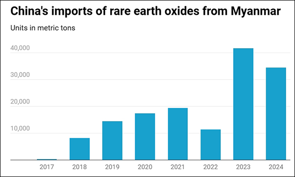 在今年4月的貿易戰中率先“眨眼”後,特朗普政府被曝考慮從緬甸獲取稀土供應,圖為近年來中國從緬甸進口的稀土氧化物數額 單位:公噸