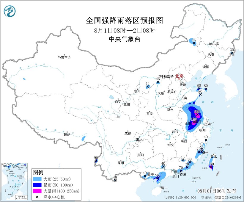 預計,8月1日08時至2日08時,安徽中南部和東部、江蘇大部、山東南部和東部沿海、遼東半島東南部、台灣島中南部等地有大到暴雨,其中,安徽南部、江蘇中部和西南部、台灣島南部等地的部分地區有大暴雨(100~230毫米);此外,內蒙古東北部和河套地區、陝西東北部、雲南西北部、廣西南部、廣東東部和西南部、福建東部、浙江東南部等地的部分地區有大到暴雨。上述部分地區伴有短時強降水(最大小時降雨量20~50毫米,局地可超過70毫米),局地有雷暴大風等強對流天氣。
