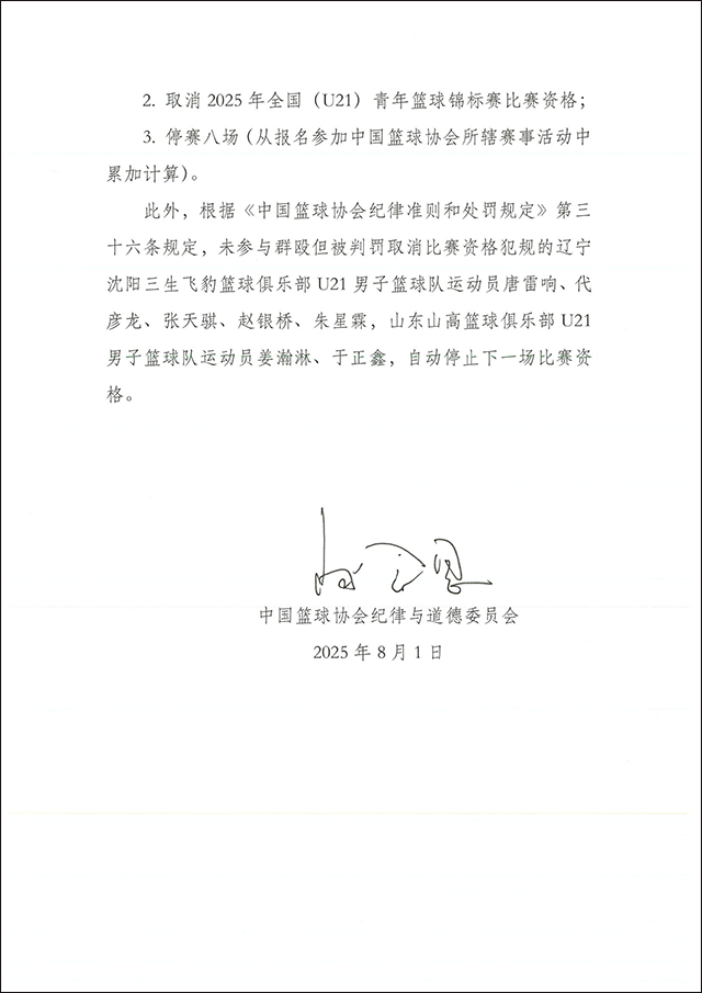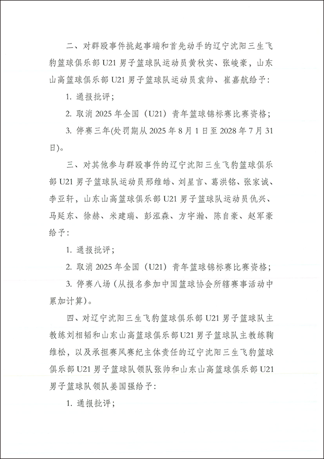 通報顯示,兩隊均被取消2025年全國(U21)青年球錦標賽比賽資格;黃秋實、張峻豪(遼寧)、袁帥、崔嘉航(山東)被取消2025年U21錦標賽比賽資格,停賽三年;其他8名球員禁賽8場。