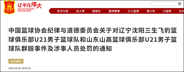 中國籃球協會網站8月1日發佈通報稱,7月30日,2025年全國(U21)青年球錦標賽第一階段河南濟源賽區第七輪第21場,遼寧瀋陽三生飛豹籃球俱樂部U21男子籃球隊對陣山東山高籃球俱樂部U21男子籃球隊比賽中,第三節出現運動員羣毆事件。