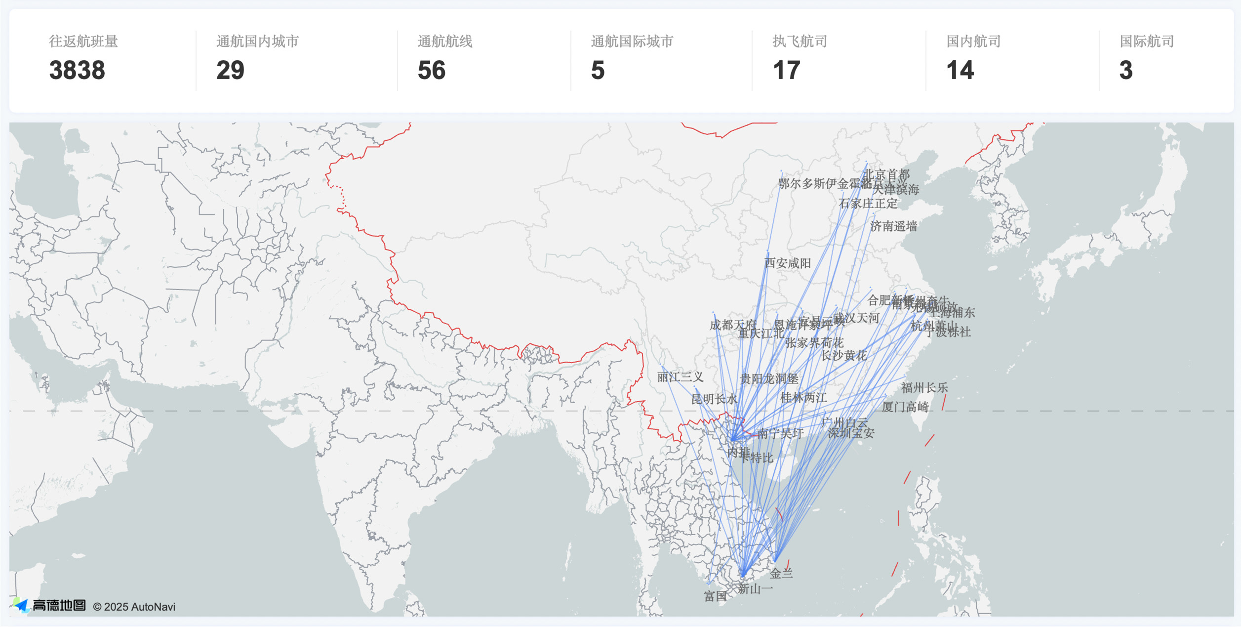 航班管家DAST平台提供給觀察者網的數據顯示,截至2025年7月31日,越南共有5座機場與中國大陸29座城市開通了直飛客運航線。
