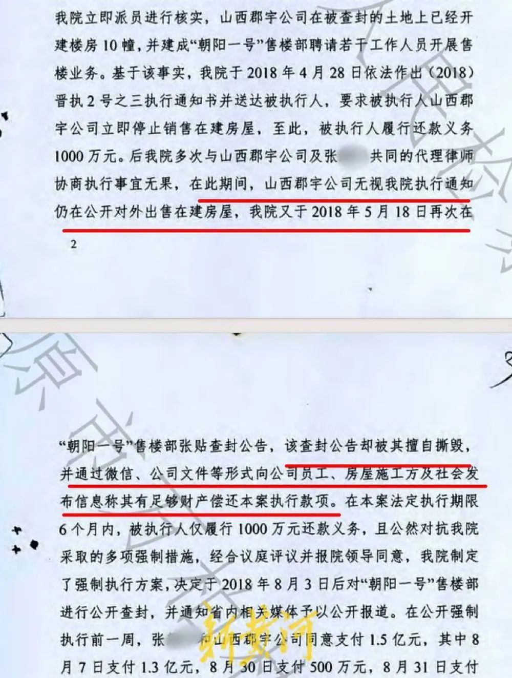 “張某華涉及省高院作出的2號執行裁定書和3號執行通知書,兩個執行案件的事實、證據具有交叉關係不可分割,張某華及山西郡宇公司利用他人賬户通過‘體外循環’走賬12億元、非法建房出售所得,這裏面既有償還2號案債務的責任,也有償還3號案的責任,其執行能力對應的執行義務包括兩案,張某華並未履行全部執行義務,至今還欠款近2億元未還。另查明,山西郡宇公司由張某華持股95%。法院偷換被執行主體概念,以山西郡宇公司並非本案被執行人為由駁回起訴,實在令人難以理解。”邢先生説,山西坤澤集團不服一審判決,已經提起上訴。