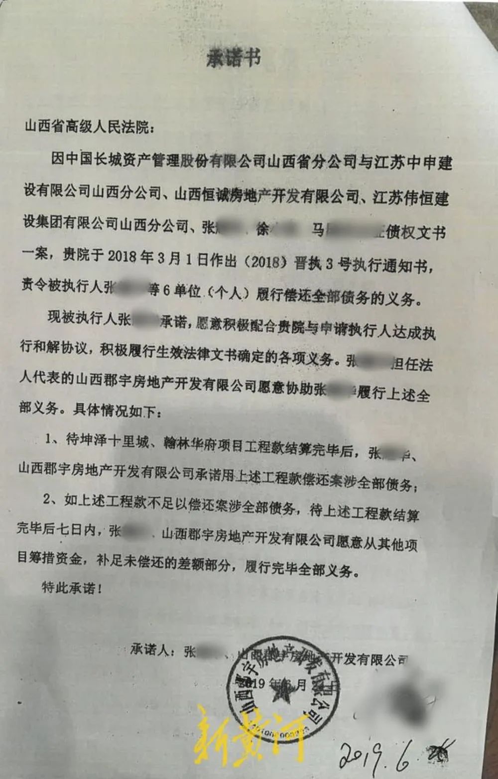 根據2019年6月張某華、山西郡宇公司向山西省高院出具的《承諾書》顯示:貴院於2018年作出(2018)晉執3號執行通知書責令被執行人張某華等6單位(個人)履行償還全部債務的義務,現被執行人張某華承諾,願意積極配合貴院與申請執行人達成執行和解協議,積極履行生效法律文書確定的各項義務。張某華擔任法人代表的山西郡宇公司願意協助張某華履行上述全部義務。具體情況如下:待坤澤十里城、翰林華府項目工程款結算完畢後,張某華、山西郡宇公司承諾用上述工程款償還案涉全部債務;如上述工程款不足以償還案涉全部債務,張某華、山西郡宇公司願意從其他項目籌措資金,補足未償還的差額部分,履行完畢全部義務。