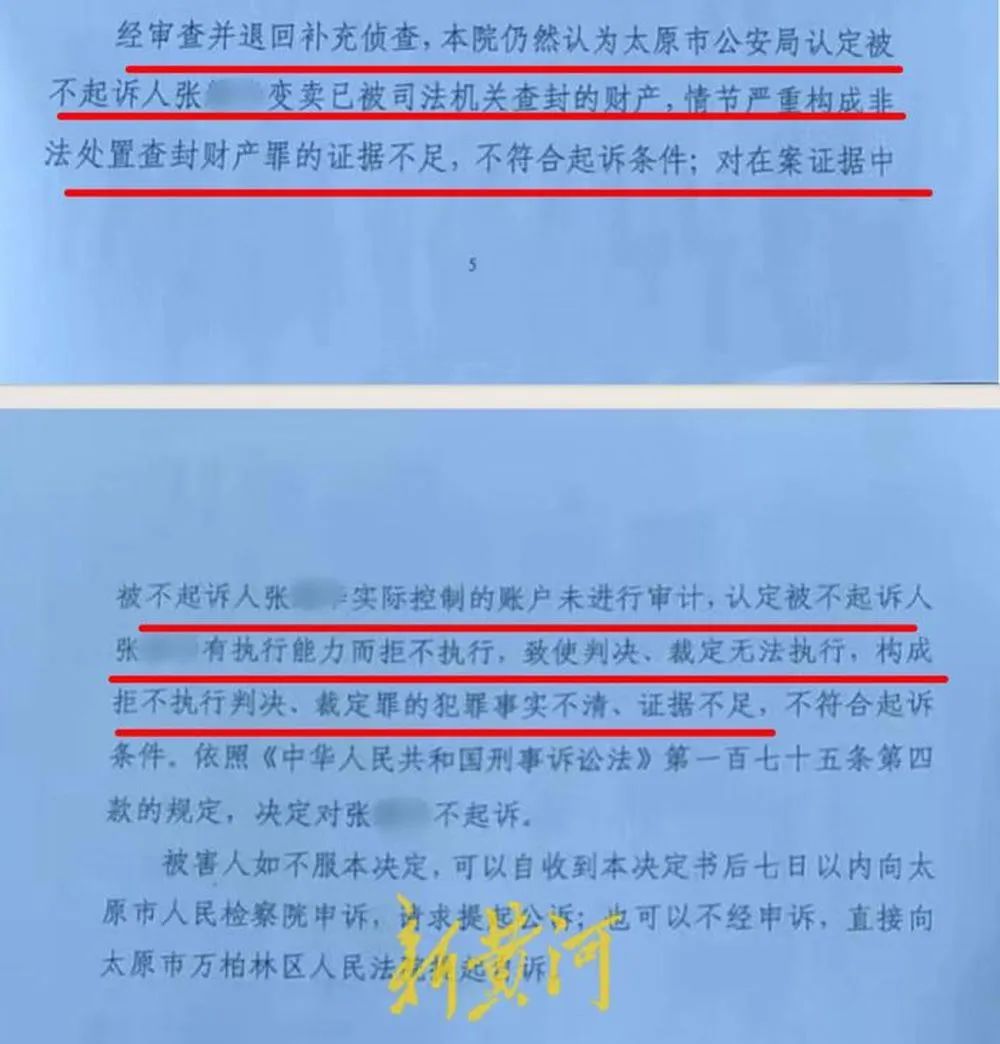 2019年3月,山西省高院將被執行人張某華涉嫌拒不執行判決、裁定犯罪,非法處置查封、扣押、凍結財產犯罪,移交山西省公安廳刑事立案偵查,省公安廳指定太原市公安局辦理,2019年5月,太原市公安局立案偵查,張某華被刑拘,後被取保候審。該案由太原市公安局偵查終結後,2021年7月移交太原市萬柏林區人民檢察院審查起訴。2021年11月,萬柏林區人民檢察院以“事實不清、證據不足,不符合起訴條件”為由作出不起訴決定。