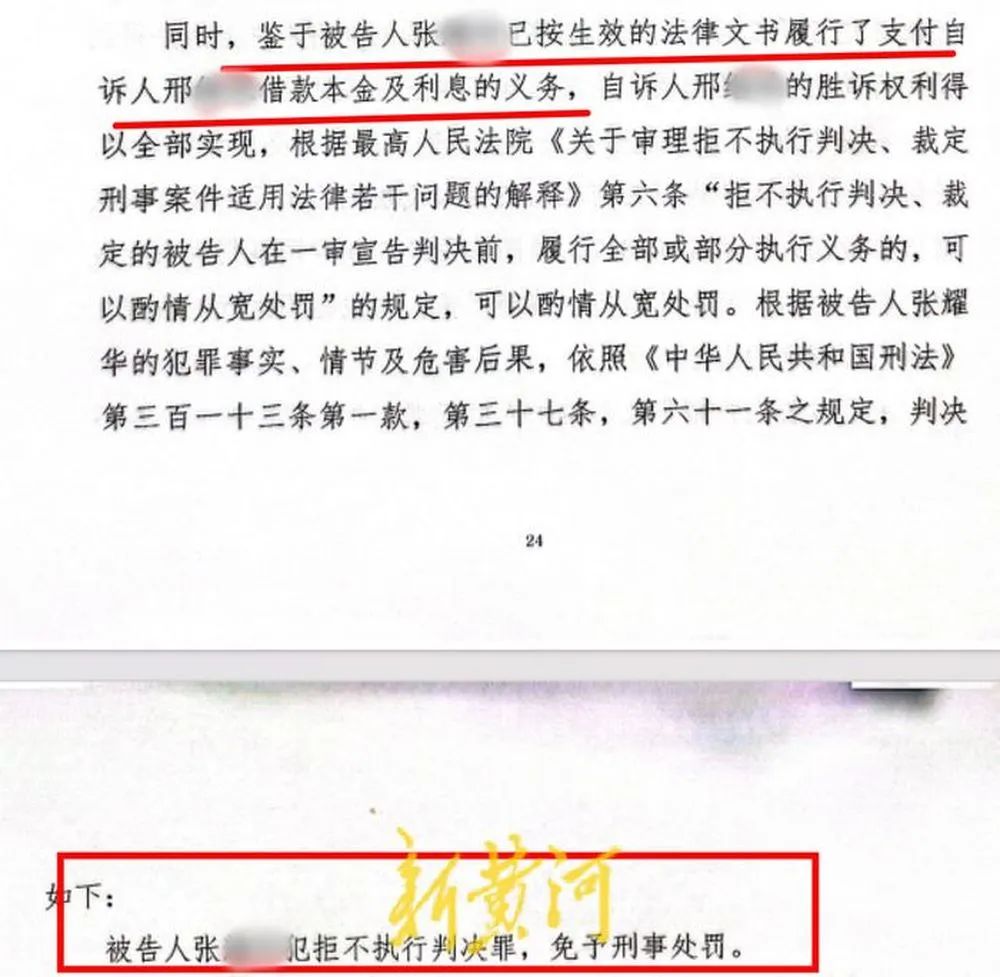 邢先生説,在萬柏林區人民檢察院作出不起訴決定後,2023年9月,公司老闆邢某承向法院提起刑事自訴,請求以被告人張某華犯拒不執行判決、裁定罪追究其刑事責任,同年9月,萬柏林區人民法院以證據不足為由作出刑事裁定不予受理。邢某承不服裁定向太原市中級人民法院提出上訴,太原市中院於2023年11月作出刑事裁定,指令萬柏林區法院立案受理。2024年7月10日,萬柏林區法院經審查認定:張某華將其本人及涉案公司的往來資金通過其公司財務人員張某等人及其實際控制的“太原奇異鳥商貿有限公司”公户等關聯賬户走賬以“賬外賬”“體外循環”的方式規避執行;同時,張某華未徵得山西省高院同意即在已被該院查封的土地上進行商業開發,其資產變動及損益情況也未及時全面向法院報告,張某華的上述行為系對法院的判決有能力執行而拒不執行,情節嚴重。法院同時認為,在太原市公安局對其立案偵查一週後,張某華將剩餘執行款全部支付邢某承,鑑於自訴人的勝訴權利得以全部實現,可以對張某華酌情從寬處罰。最終,判決張某華犯拒不執行判決罪,免予刑事處罰。