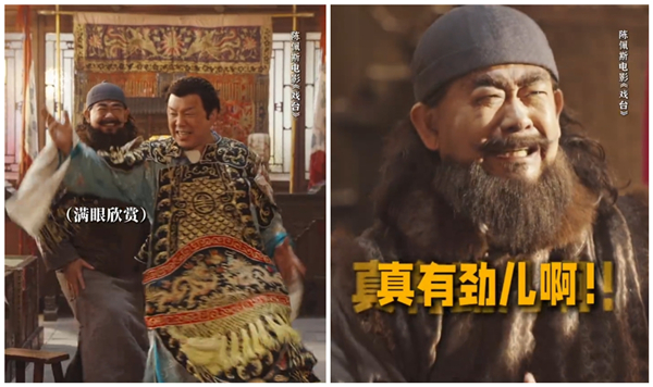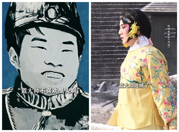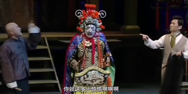 “此一番連累你多受驚慌”,台上項羽的京劇唱腔裏夾雜着唐山落子的升調,內行無法忍受,外行大帥卻直呼“忒好啊”,還領掌引得滿堂喝彩,諷刺度拉滿。