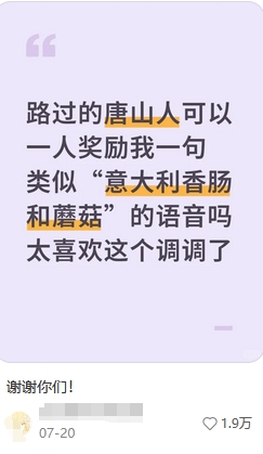 這讓人想起最近網上的流行梗,當你唱出“我們的祖國是花園”時,你就學會唐山話了。